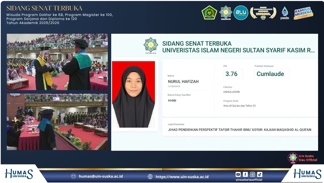 Fush– Nurul Hafizah, mahasiswi Jurusan Ilmu Al-Qur’an dan Tafsir (IAT), sukses meraih predikat sebagai lulusan terbaik Fakultas Ushuluddin Universitas Islam Negeri (UIN) Sultan Syarif Kasim (Suska) Riau pada prosesi wisuda periode VII, Rabu, (15/102025). Ia berhasil menyelesaikan studinya dengan Indeks Prestasi Kumulatif (IPK) 3.76.