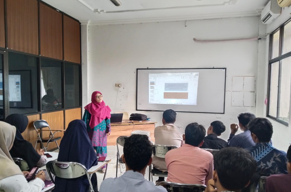 Memasuki acara inti, peserta kuliah tamu dibagi menjadi dua kelompok di dua lokal terpisah. Di Lokal Tiga Belas, materi disampaikan oleh Dr. Hj. Fitri Yeni M. Dalil, Lc., M.Ag. dengan materi “Tafsir Saintifik Sebagai Peluang Riset”. Dalam paparannya, Dr. Fitri Yeni memaparkan bagaimana Al-Qur’an dan penemuan sains modern dapat berdialog secara harmonis.